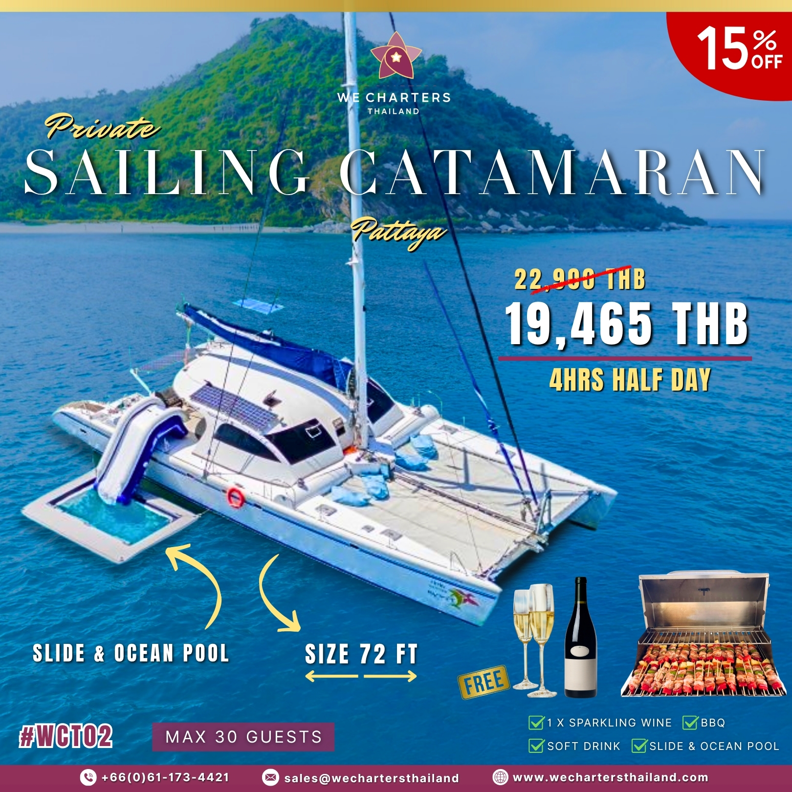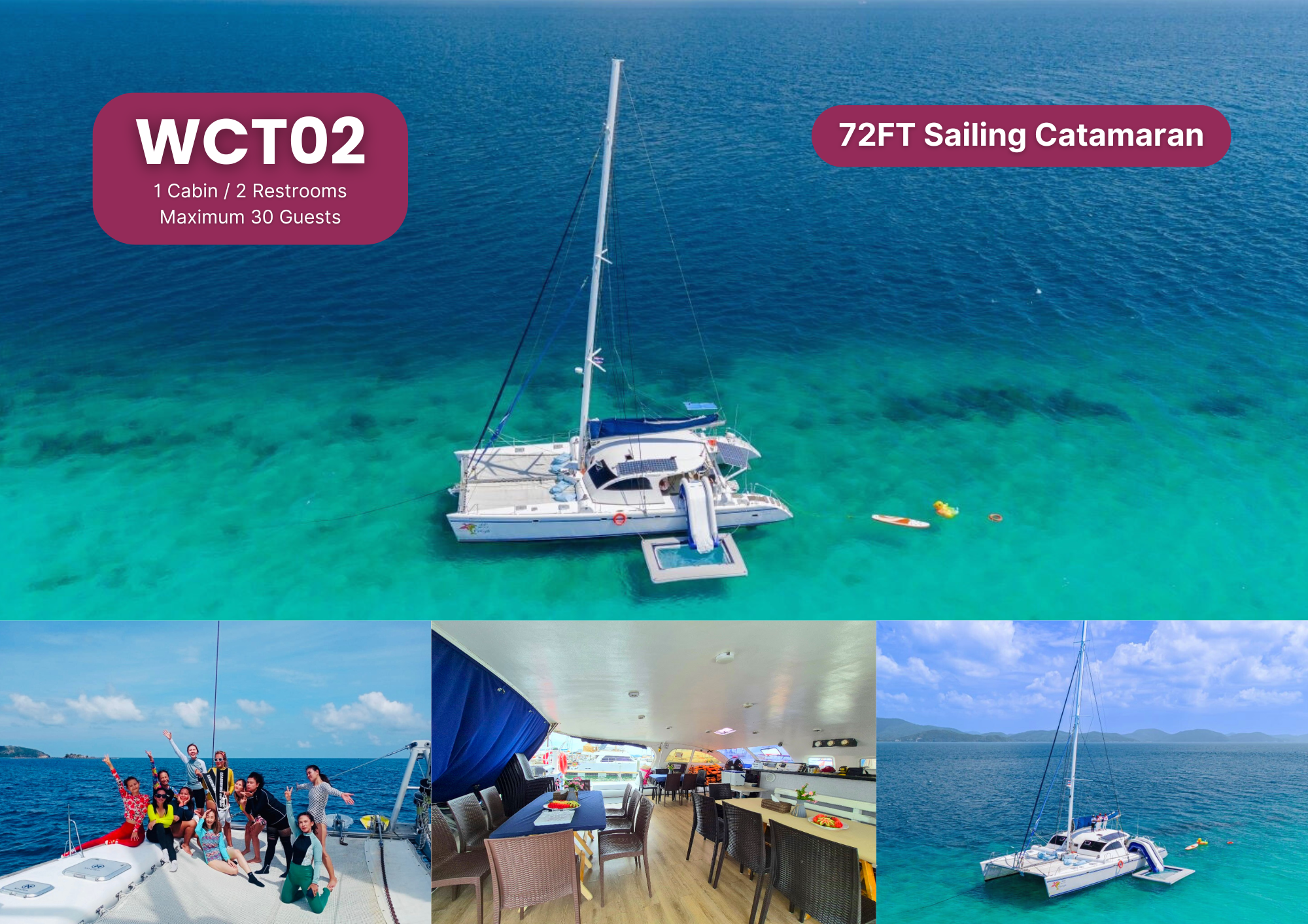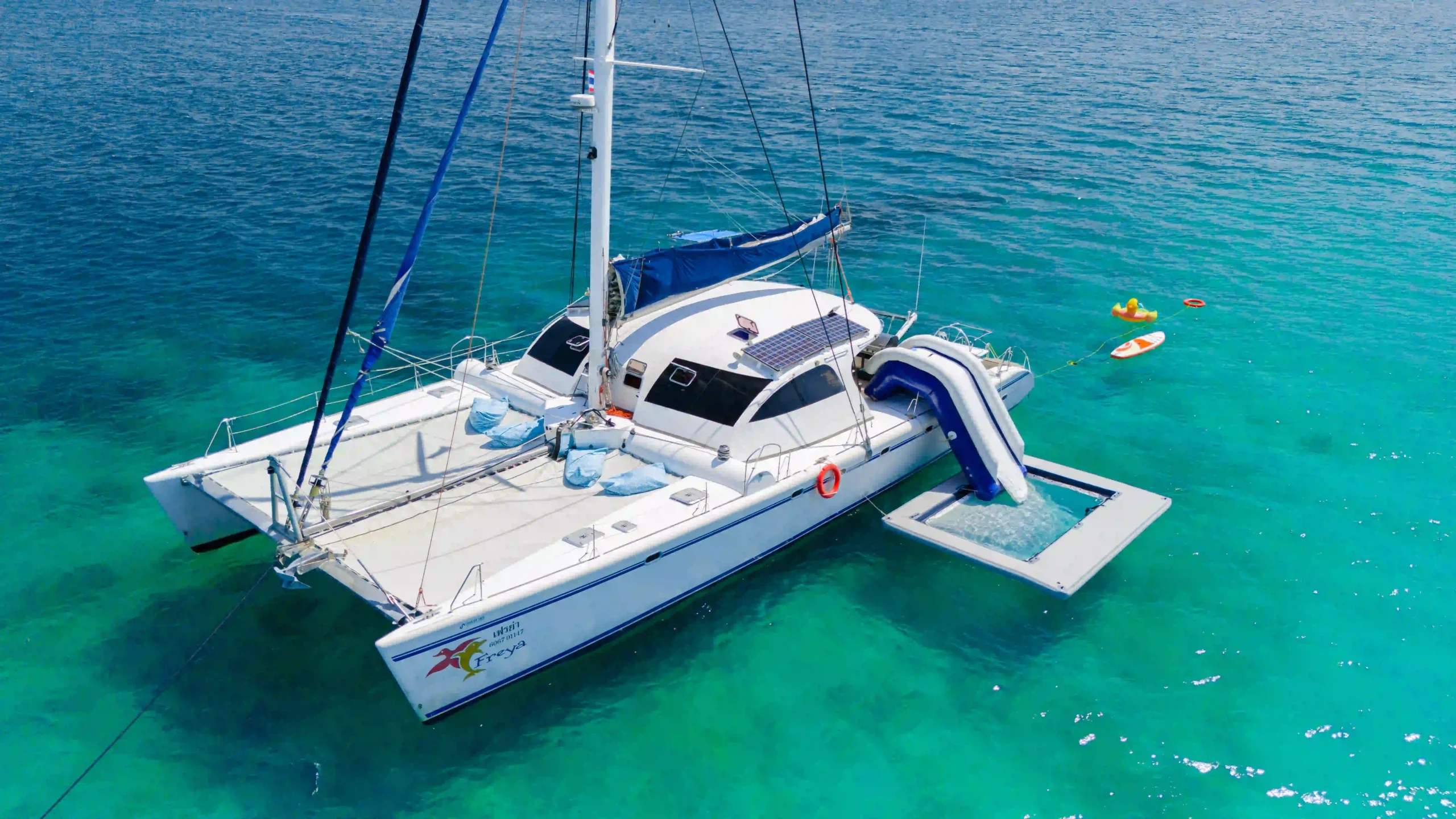 Welcome aboard Freya, a stunning sailing catamaran designed for unforgettable ocean adventures in the Gulf of Thailand. Operated by We Charters Thailand, a Tourism Authority of Thailand registered company based in Pattaya, Freya offers the perfect blend of luxury, comfort, and excitement for groups of up to 35 passengers.