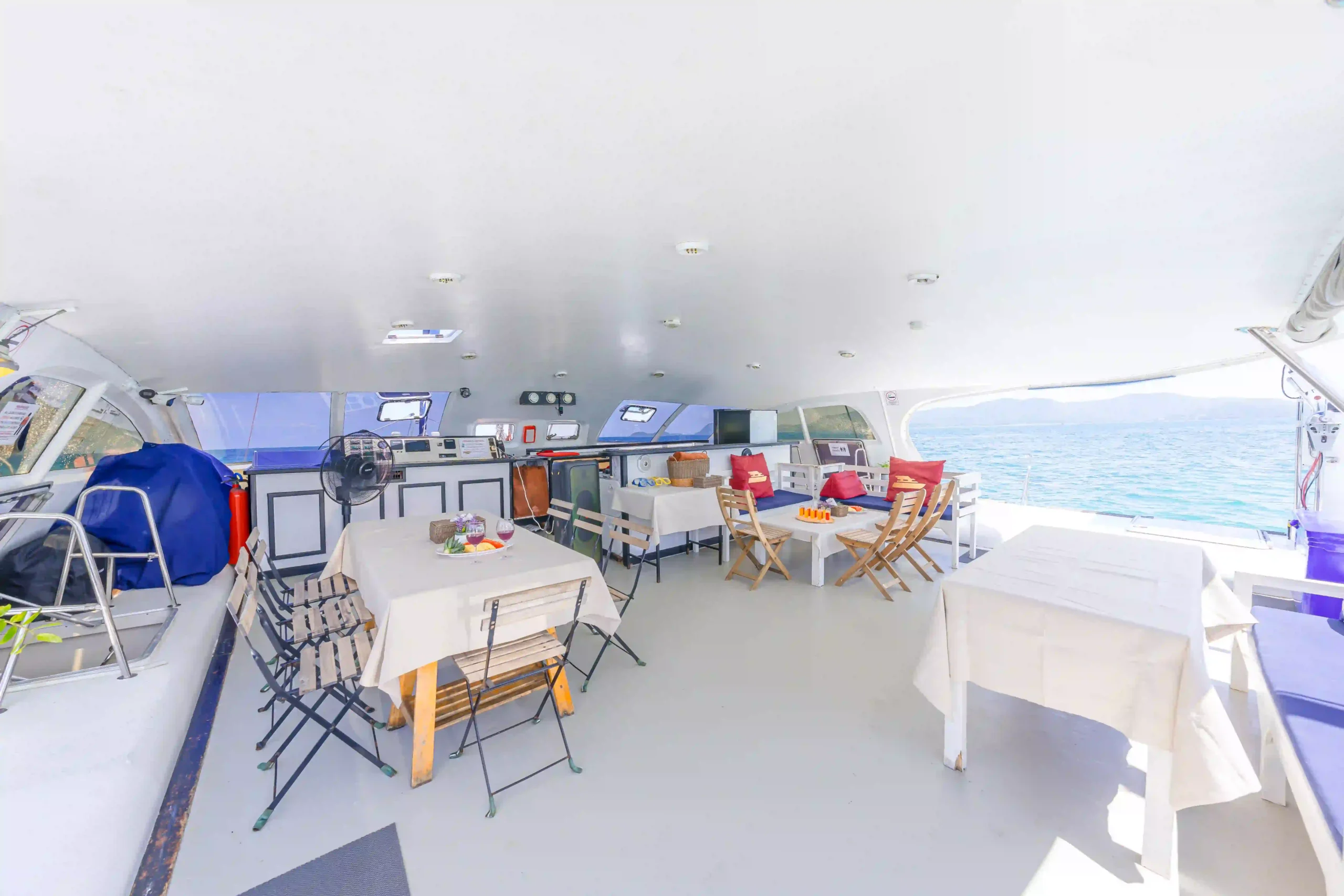 From the moment you step onto Freya’s spacious deck, you’ll feel the difference. The yacht features a covered flybridge with generous seating and panoramic views — ideal for relaxing in the shade while soaking in the tropical surroundings. Inside, the air-conditioned sofa salon offers a cool retreat with plush seating and elegant finishes, perfect for socializing or unwinding between activities.