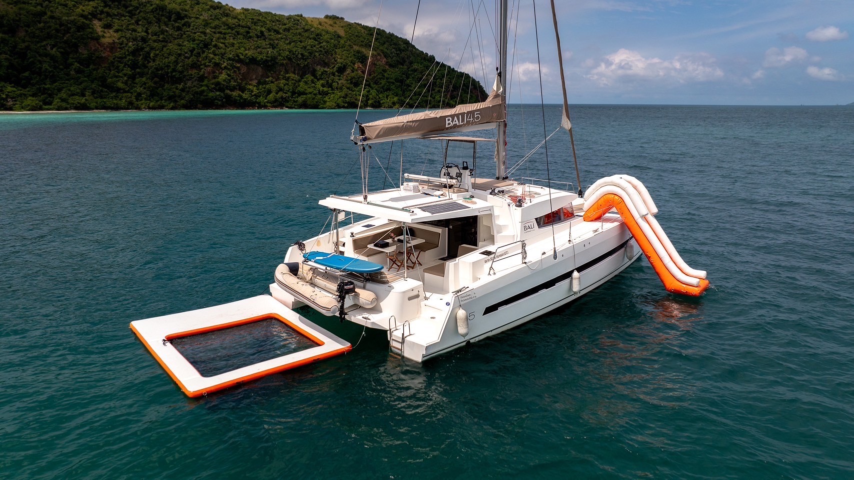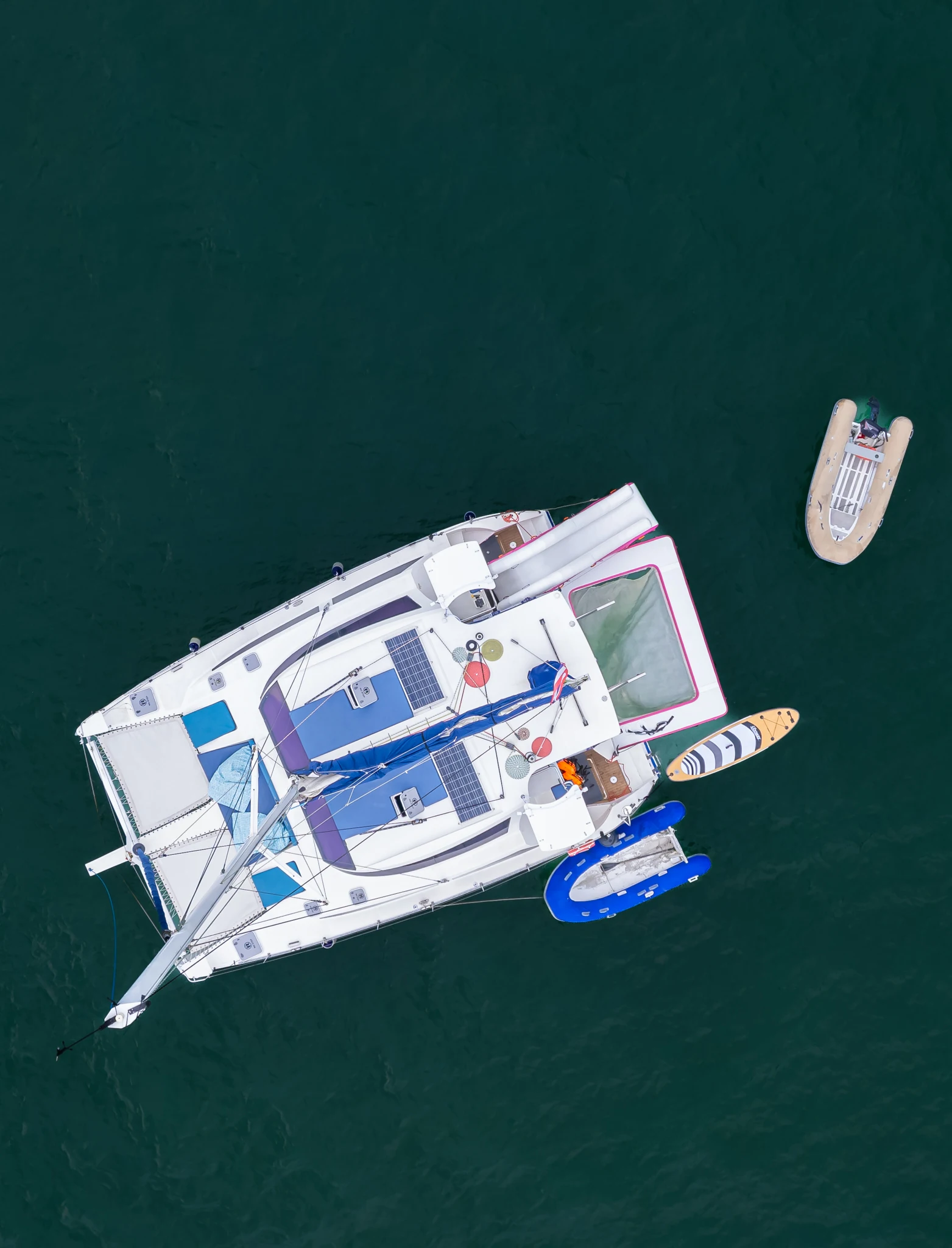 Entertainment and adventure are at the heart of the Thai Angel experience. Guests can dive into the fun with a water slide, splash around in the ocean pool, or explore nearby islands using the dinghy tender. For those seeking active pursuits, Thai Angel offers paddle boards, snorkeling gear, and fishing equipment with bait, ensuring every guest finds their perfect way to enjoy the sea.