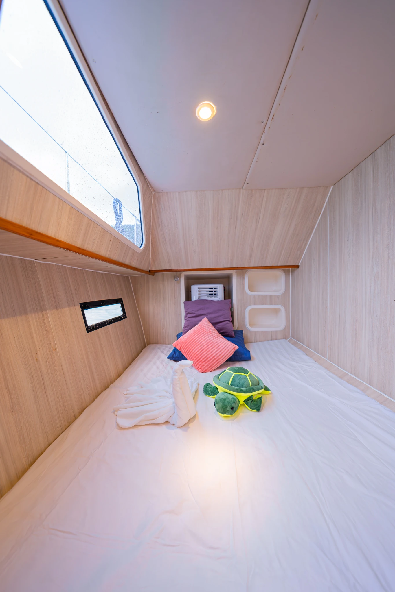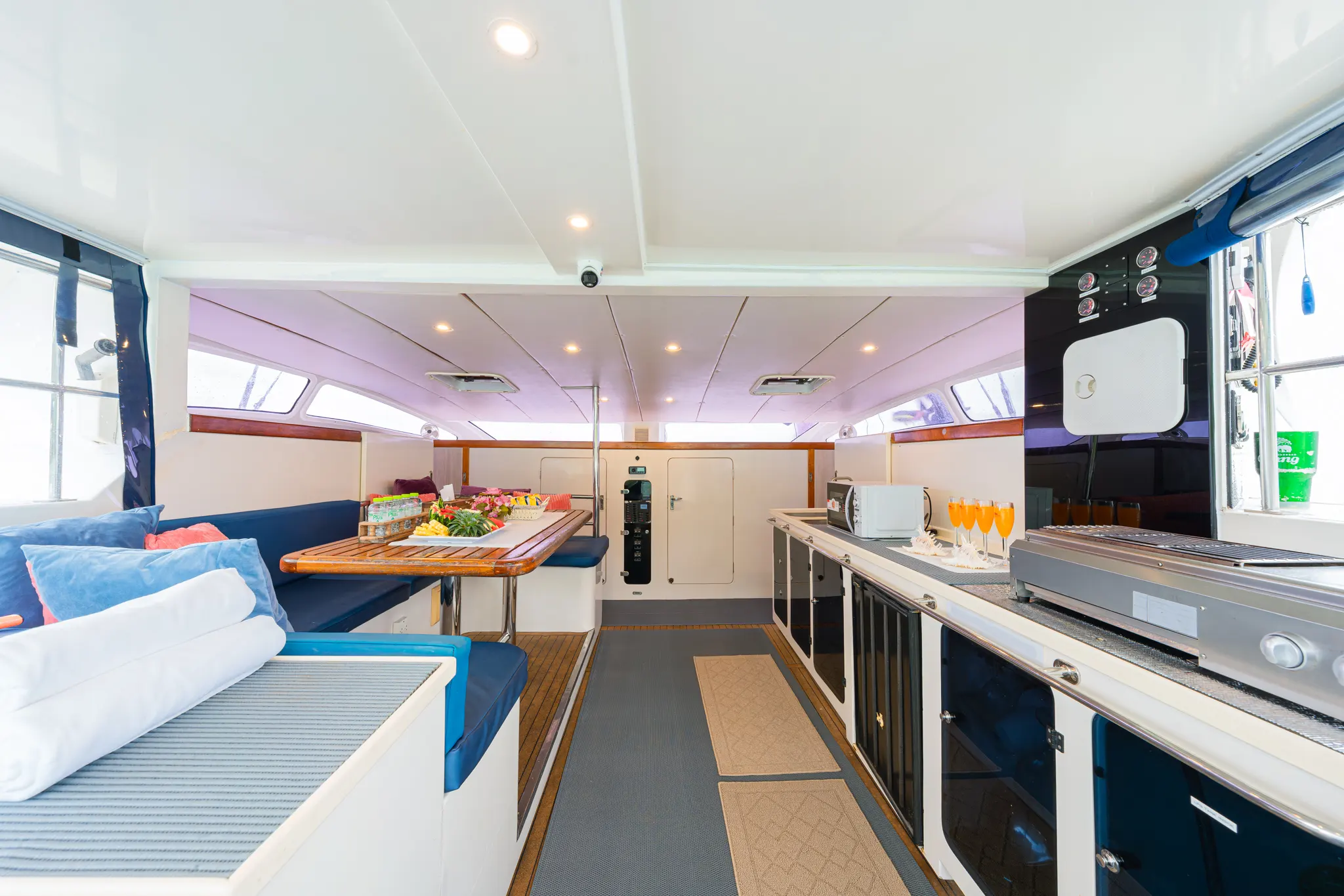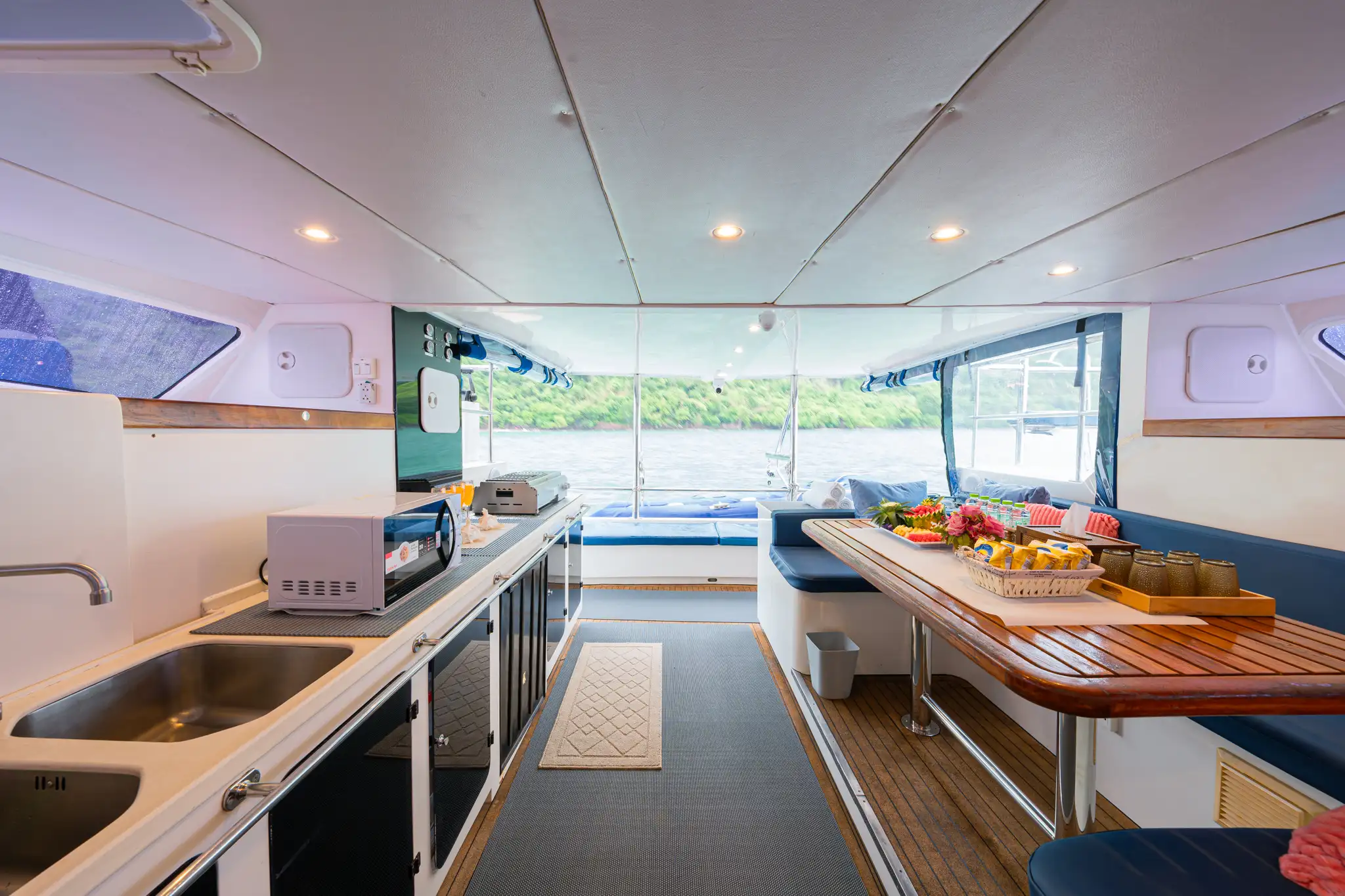 From the moment you step aboard, Thai Angel welcomes you with a thoughtfully designed layout that blends comfort, style, and open-air freedom. The yacht features a spacious covered outdoor seating area complete with a BBQ station, perfect for socializing, dining, and enjoying the tropical breeze. Inside, the sofa salon offers a cozy, air-conditioned retreat for guests seeking a break from the sun.
